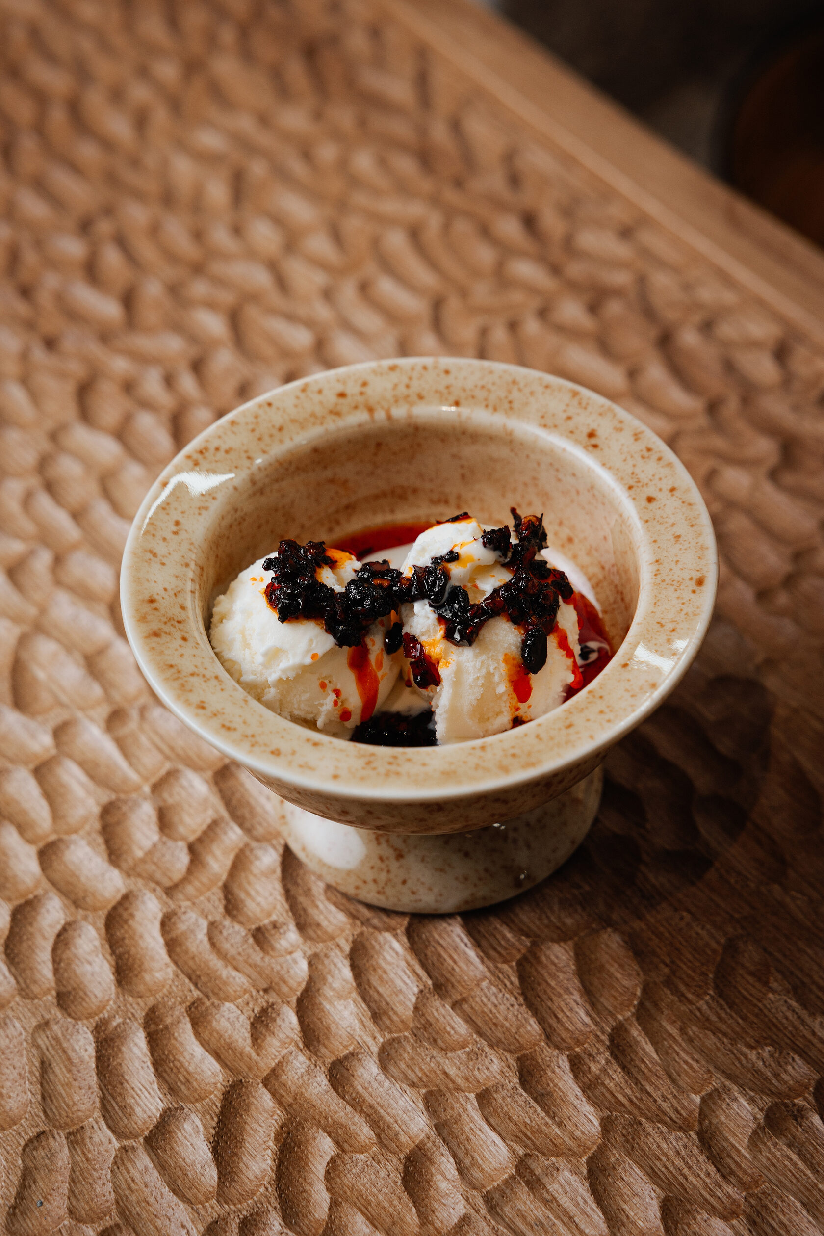 Сливочное мороженое с добавлением Lao Gan Ma - знаменитый китайский чили-соус с ферментированными соевыми бобами и ароматным маслом. Сладость усиливает специи, сливки смягчают остроту, а соевые бобы дают карамельно-ореховую глубину.