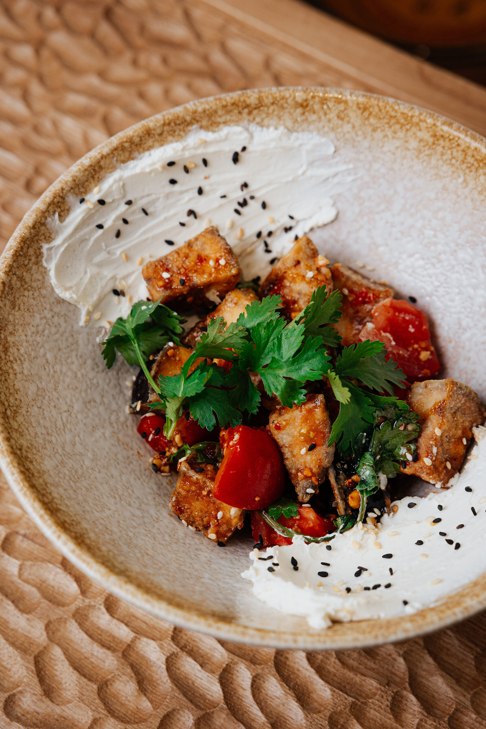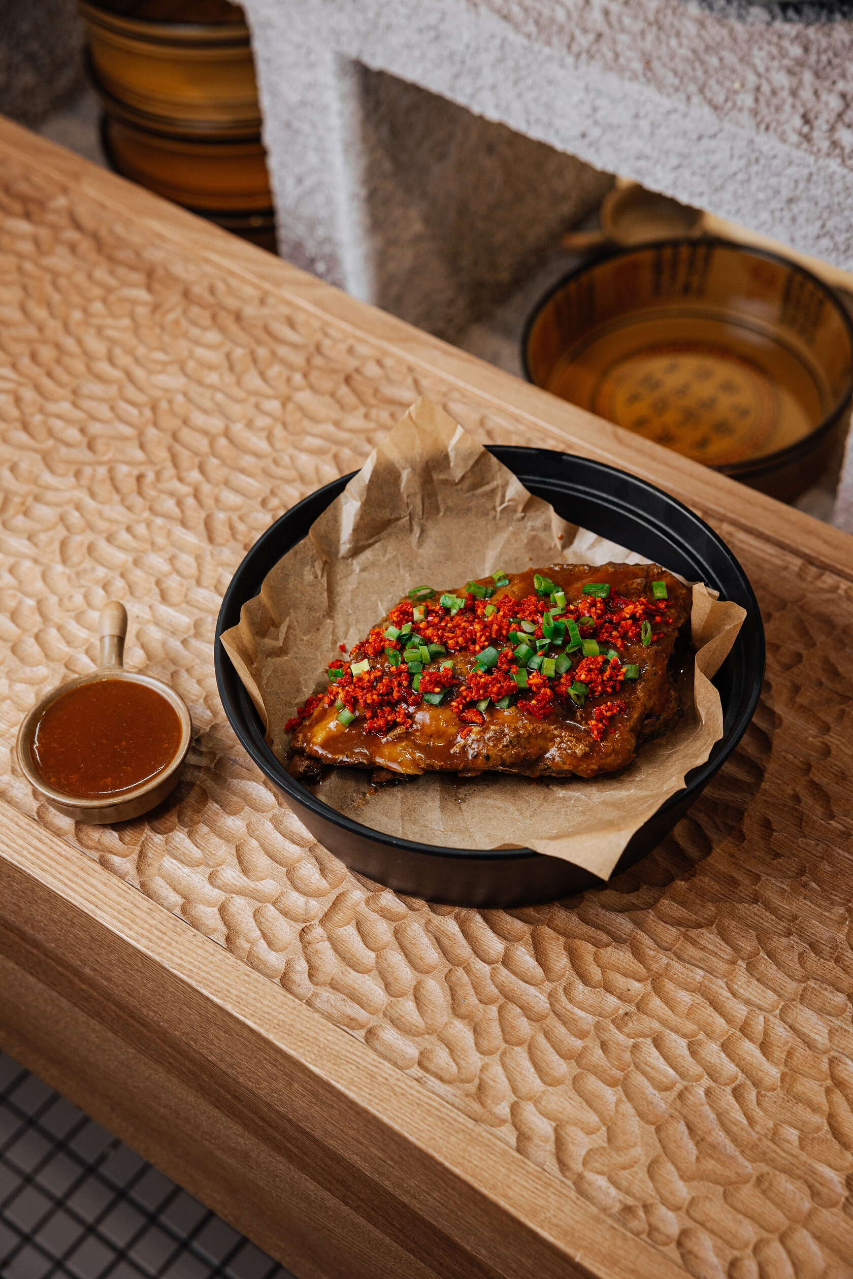 Нежные говяжьи щечки, томленные в имбире и протушенные с пак-чоем, луком и капустой кимчи. При подаче заливаются сырным соусом и украшаются кинзой, зеленым маслом и маслом с мякотью чили.