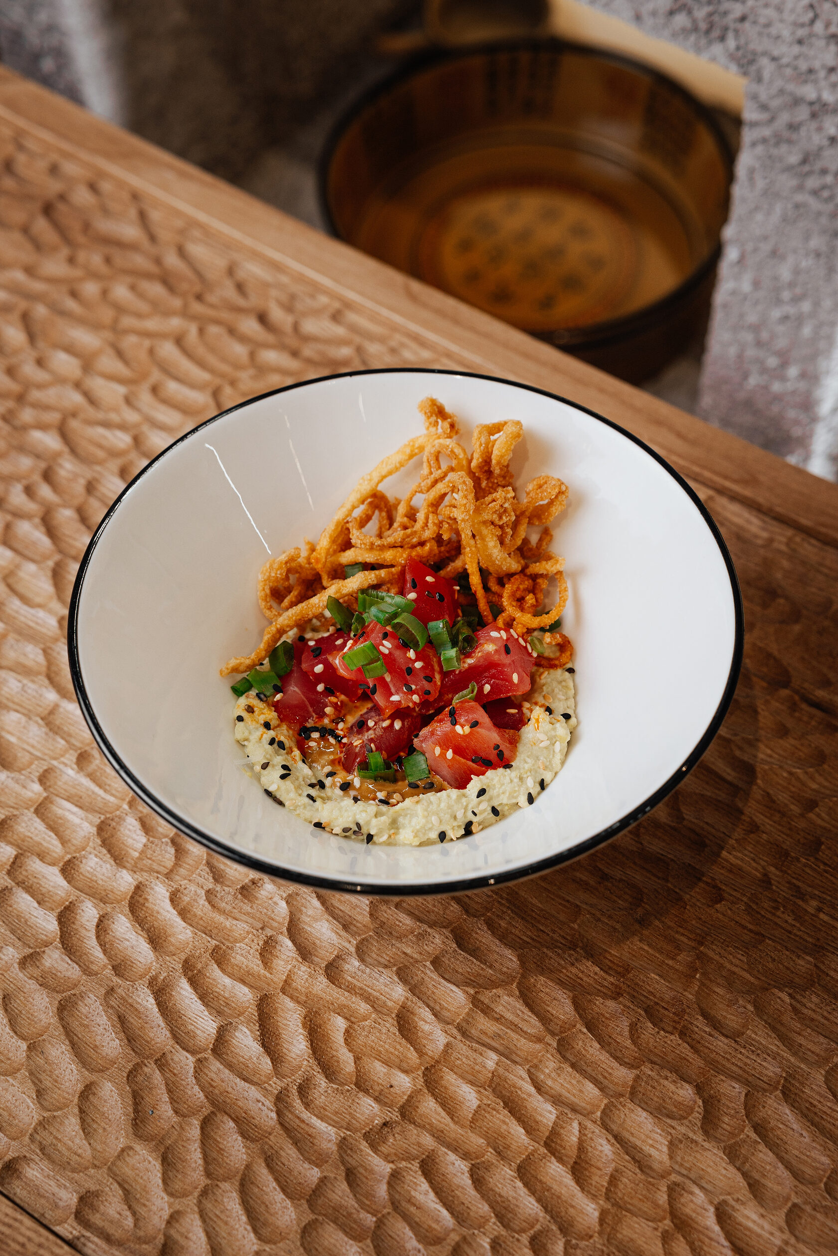 Свежий тунец, пропитанный креветочно-лаймовым соусом, выкладывается на подушку из соуса дип эдамаме. Для хруста мы добавляем обжаренное тесто из фритюра, украшаем смесью кунжута и зеленым луком.