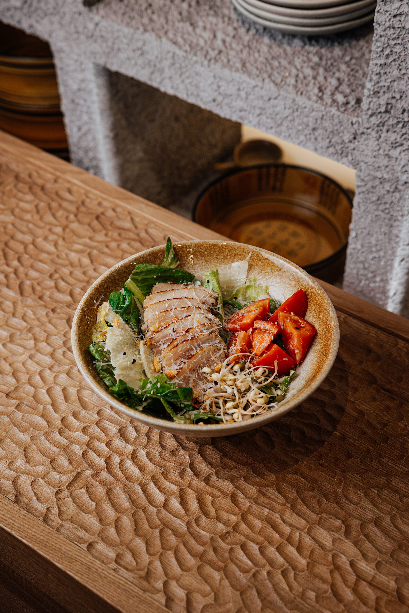 Тонкая нарезка листьев романо и айсберга в сочетании с куриной грудкой Часю и кунжутно-дрессенговым соусом. Украшаем хрустящим тестом и фурикакэ.
