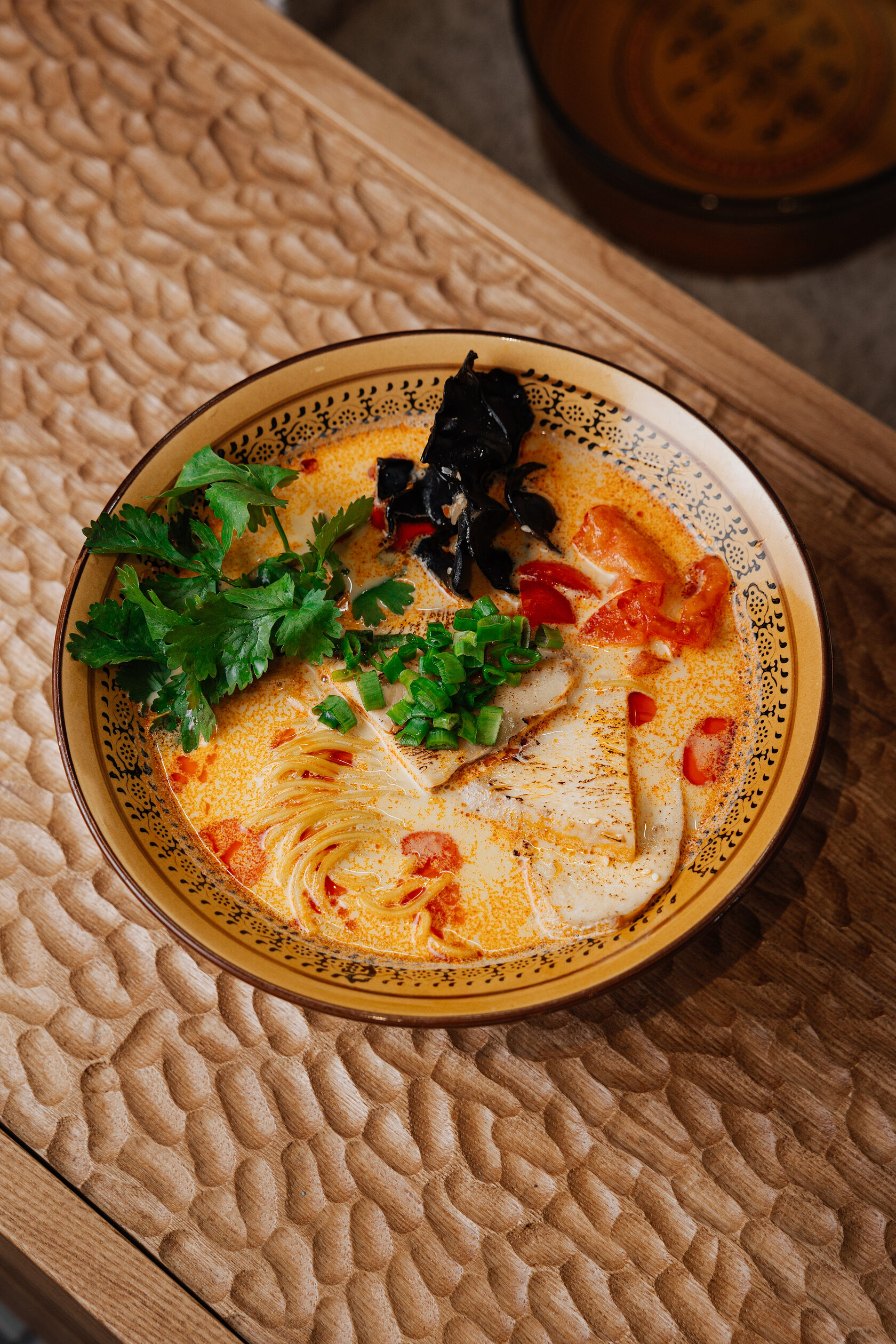 Рамен, приготовленный в стиле Том ям. В составе куриная грудка Часю, плотный куриный бульон, проваренный с лемонграссом, галангалом, корнем имбиря, листьями лайма и чесноком, с добавлением пасты Карри и Том-ям, щелочная лапша и масло Раю.