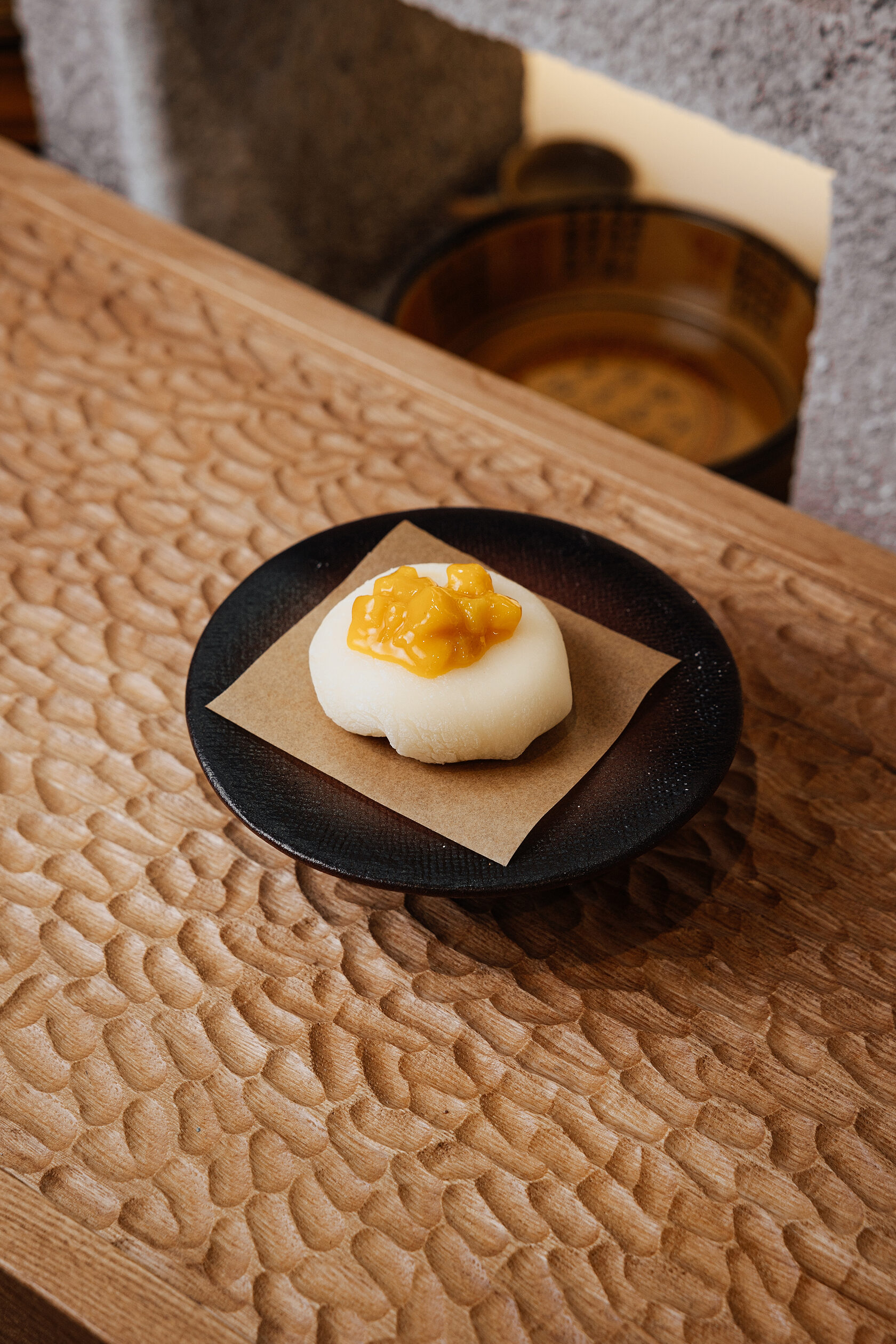 Рисовое тесто, джус боллы со вкусом клубники, нежный соус из сливочного сыра и сливок, сверху на моти выкладывается соус манго-маракуйя с цельным кубиками манго.