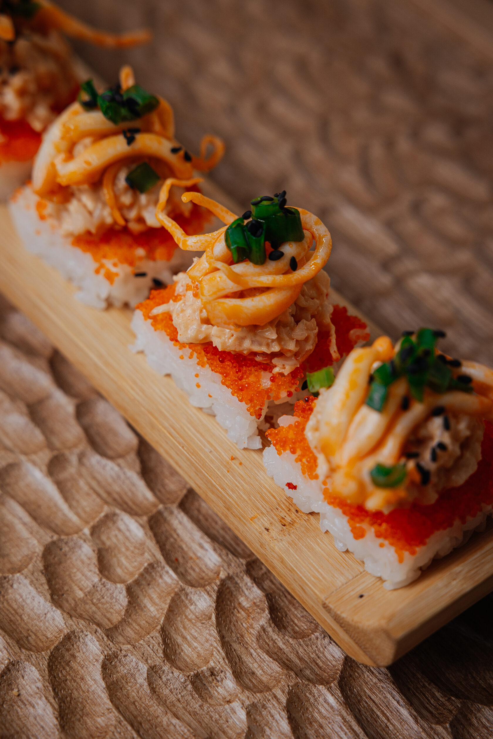 Осидзуси с креветкой Креветки в пикантном соусе с кальмаром в ароматном масле, зелёный лук и чёрный кунжут.