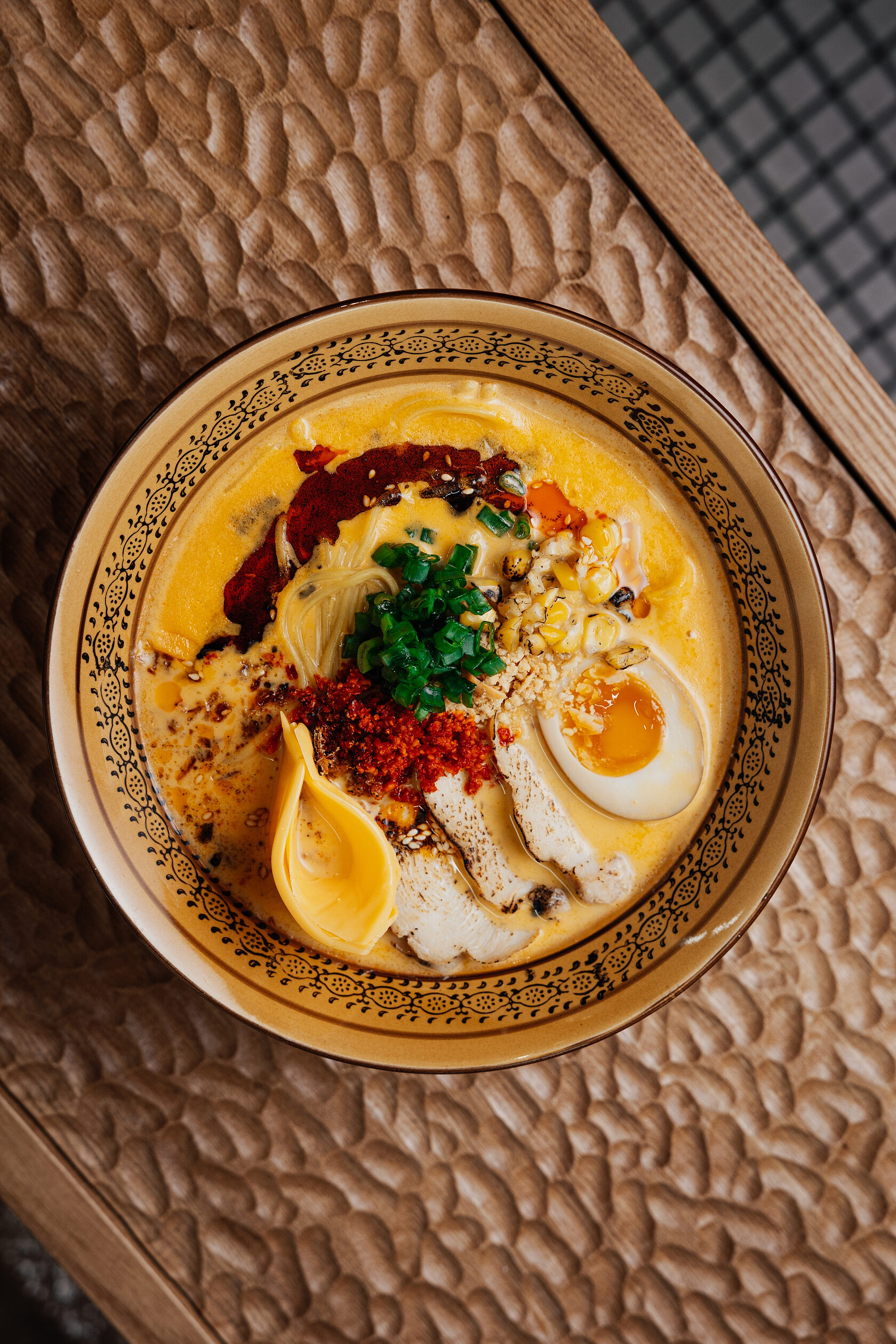 Рамен на сливочно-сырной основе с щелочной лапшой и с добавлением куриной грудки Часю. Украшается жаренным и острым арахисом, перечное масло дает легкую остринку.